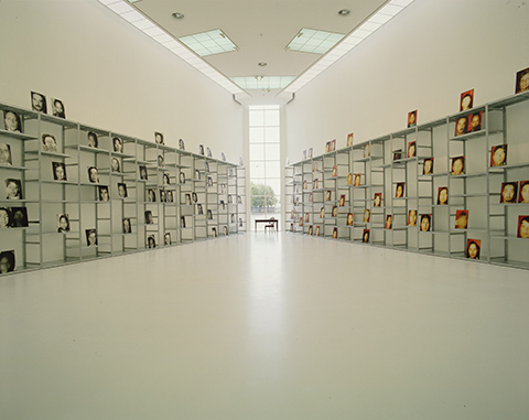 Installation von 200 Farb- und Schwarz-Weiss-Fotografien mit Langzeitbelichtung in Bibliotheksregalen, Tisch und Stuhl.