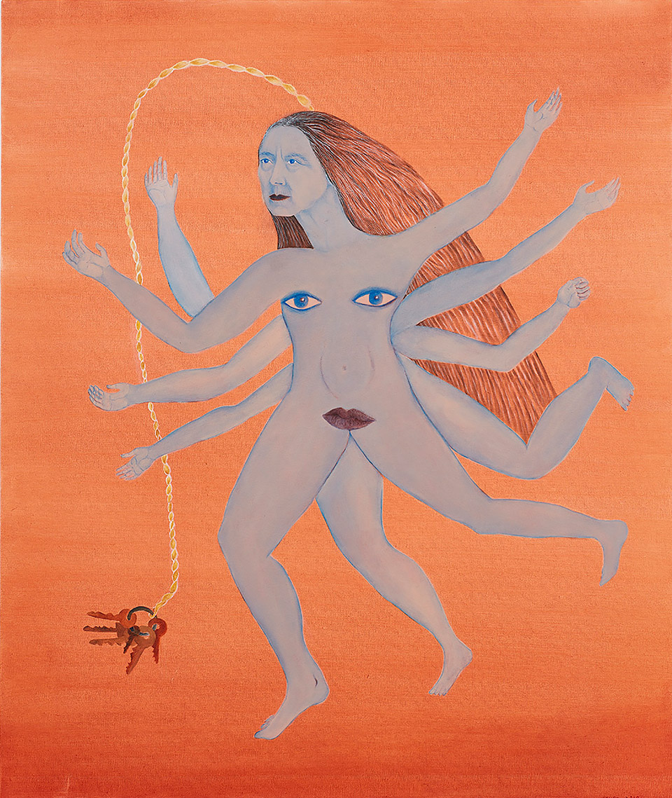 Cecilia Vicuña, Llaverito (Blue Lady) / Ladilla, Crab, 2019 Öl auf Leinwand, 109,22 x 91,44 cm Privatsammlung. Foto: Matthew Herrmann. Courtesy the artist and Lehmann Maupin, New York, Seoul, and London. © 2025 Cecilia Vicuña